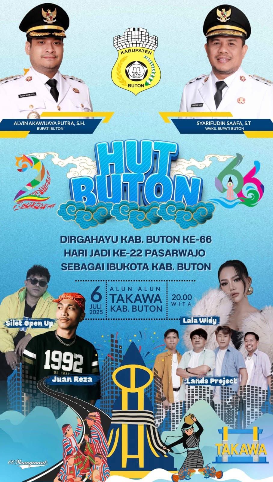 Seperti yang beredar di media sosial banyak orang maupun media sosial pribadi Alvin Akawijaya Putra, Artis yang akan menghibur kemeriahan HUT Buton ini diantaranya penyanyi lagu Pica-Pica yang viral di berbagai platform digital, Juan Reza dan Silat Open Up serta penyanyi dangdut cantik, Lala Widy.
