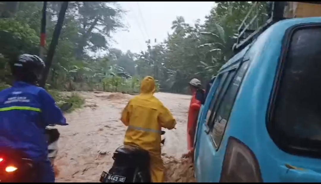 Sementara itu, keterangan salah seorang warga mengatakan bahwa banjir yang menggenangi jalan tersebut disebabkan luapan air sungai.